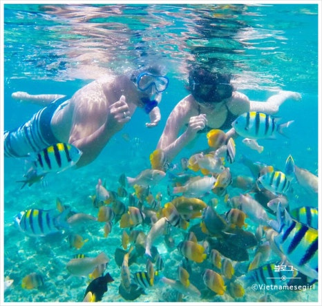 이 투어는 냐짱 선착장에서 스피드보트를 타고 출발한다. 20분 남짓 달리면 첫 번째 스노클링 포인트에 도착한다. 조류가 강하지 않고 수심이 적당해 초보자도 부담이 적다. 수영에 익숙하지 않은 사람도 튜브를 이용해 안전하게 체험할 수 있고 현지 스태프들이 가까이에서 계속 케어해준다. 혼문 섬 포인트에서는 물고기 개체 수가 많아 스노클링의 재미가 확실히 살아난다.